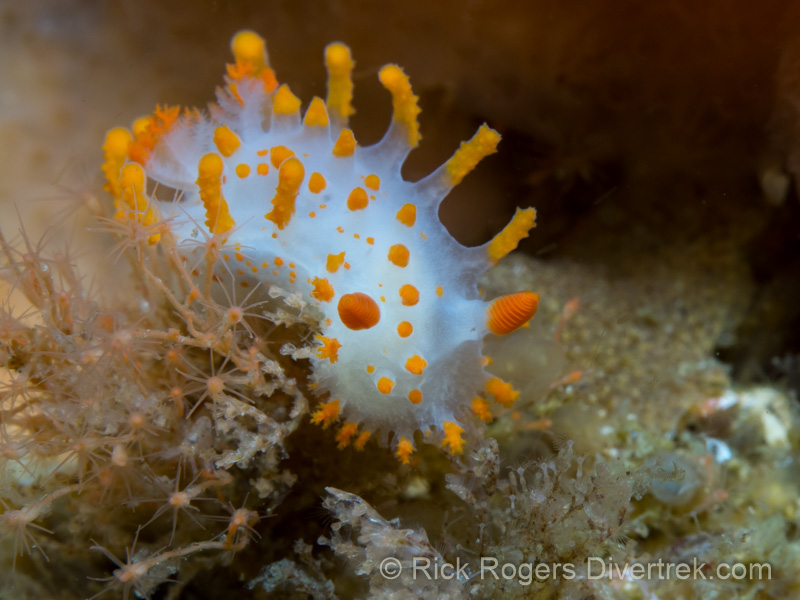 British Columbia, and the Browning Pass in particular, are well known for their macrolife. You’ll find it listed as one the top ten macro destinations in the world. The reason for this is that the life there is continually “force fed” nutrient rich water from the currents, which spurs an explosion in the diversity and quantity of life. Macro photographers will be rewarded for taking the cold (50 deg. F), and putting up with some current. The wall this year was filled with tiny crabs of all types, but I noticed that the nudibranchs weren’t as plentiful as last years’. Nudibranchs can be found at any dive site, but I had a lot of good luck at “Hoody Nudi Bay”, named in honour of the “Hooded Nudibranchs” that are found there. Here’s a sample of what I saw, to help show the diversity in not only life, but their amazing colours, forms, and textures: