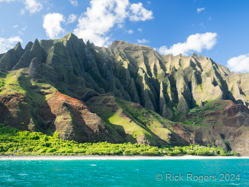Rounding the coast Northwards it becomes increasingly rugged and mountainous as you approach the scenic NaPali Coast State Park along the NW coast. Like being transported to another world, the whole trip is visually stunning and awe-inspiring. You will stop at sea caves, arches, and see some waterfalls (rain dependent) in addition to the likelihood of being greeting by Spinner dolphins.