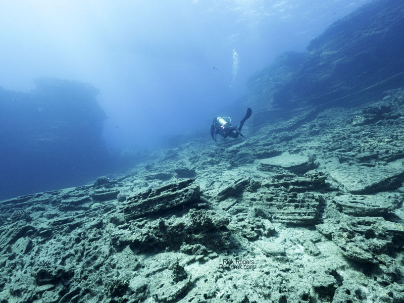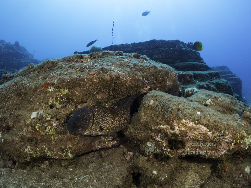 Most of the diving is done on the south shore, in the lee of the prevailing NE trade winds, and sheltered from the large winter swells from the North that pound the island. As of the time of this writing, the shore dives on the North shore (such as the famous “Tunnels”) were closed for conservation reasons. Visibility was typically in the 50-60′ range depending on rain fall amounts, tide cycle, and even wave action (from the wind) which moved murkier water around.