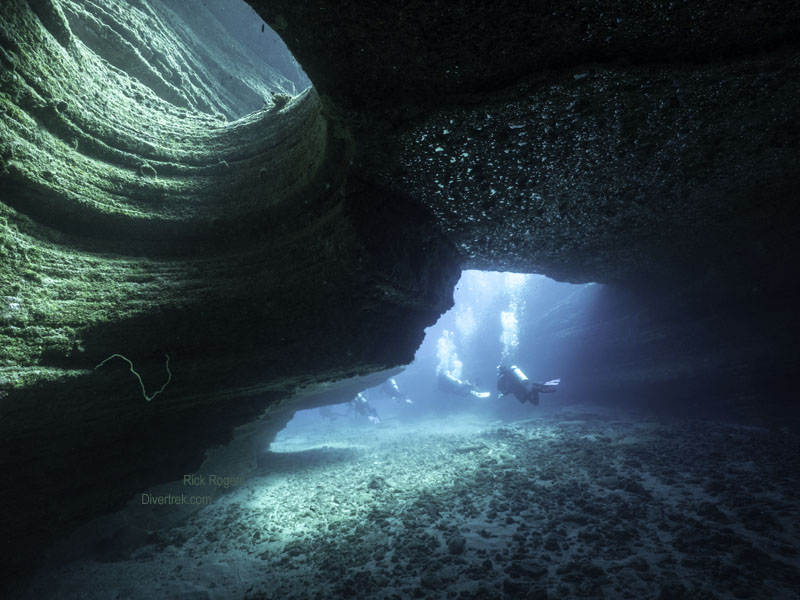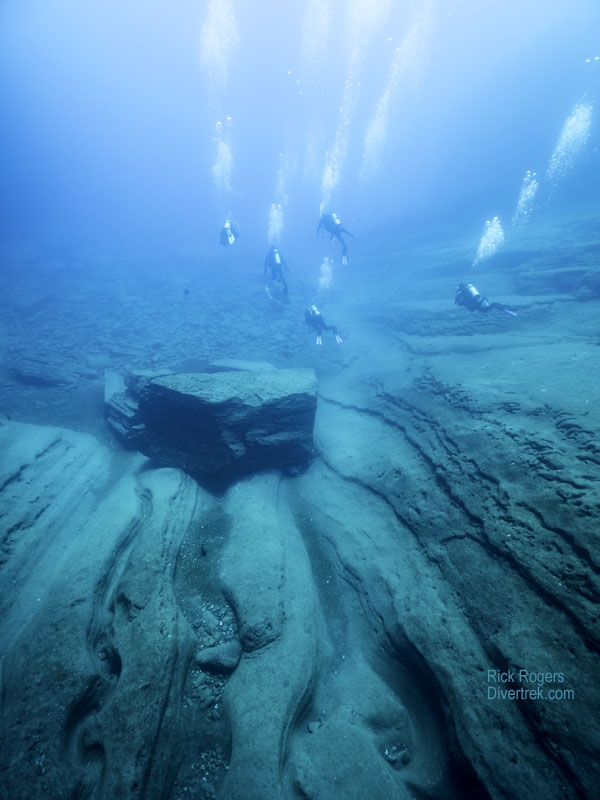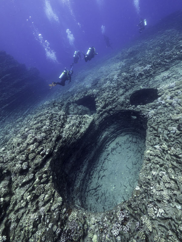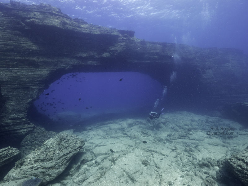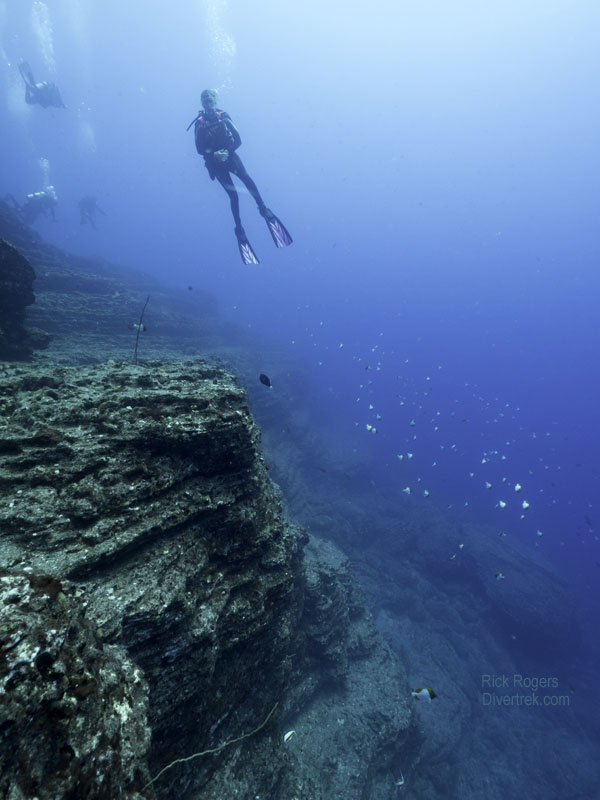 Lehua is starkly beautiful with mesmerizing geological features, such as the picturesque “keyhole”, a huge vertical crack which nearly divides the crater in half. Proceeding around the inside of the crater to the other point, the crew selected a site called “Stairways“(at the far tip of the crescent in between the islands), which was protected from the prevailing winds/waves and which had minimal current.