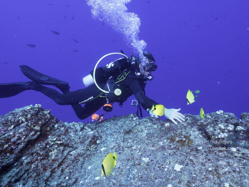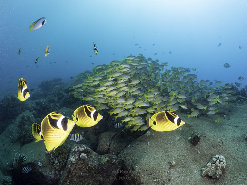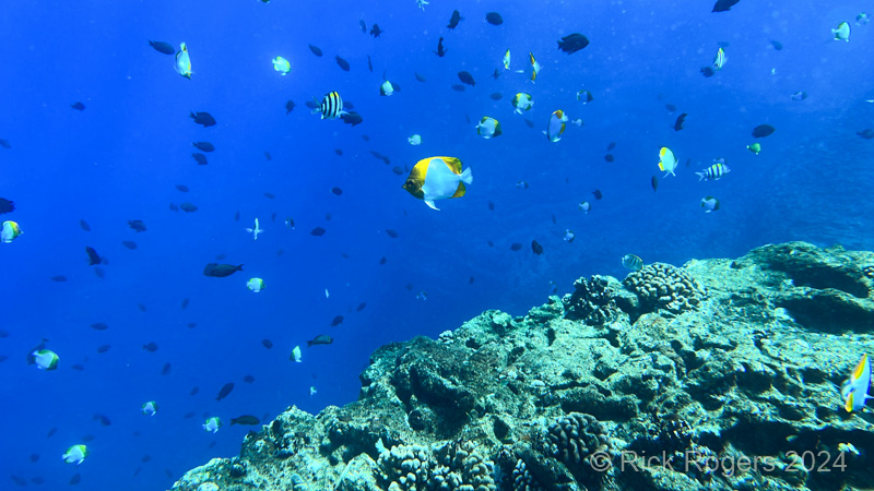 Our first dive site was at “Fish Bowl“, and like it’s name-sake you will see schools of fish there. As is typical of Kauai, the bottom is largely rocky with interspersed stony corals. Fish Bowl also has a large circular rock pit, that is a known turtle cleaning station. Maximum depth was at 70′ with a water temperature at 79 degrees Fahrenheit.
