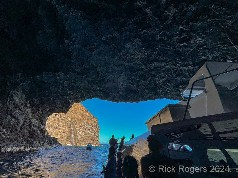 The tour is an all-day event, beginning at Port Allen on the south shore at 6 am. Their craft is a 65′ fast and stable catamaran (double-pontoon) which makes the crossing about as pleasant as is possible. We were served a hot breakfast once underway while enjoying the expansive scenery of the south coast and the sand beaches of the SW coast. If you’re prone to seasickness, now’s the time to take your medications in preparation for the crossing which sometimes can be wavy, but more so in the afternoon!