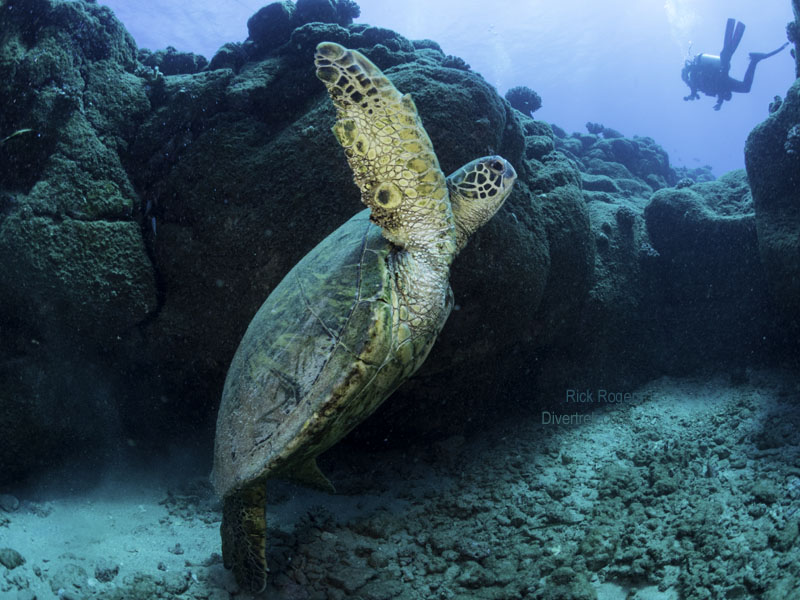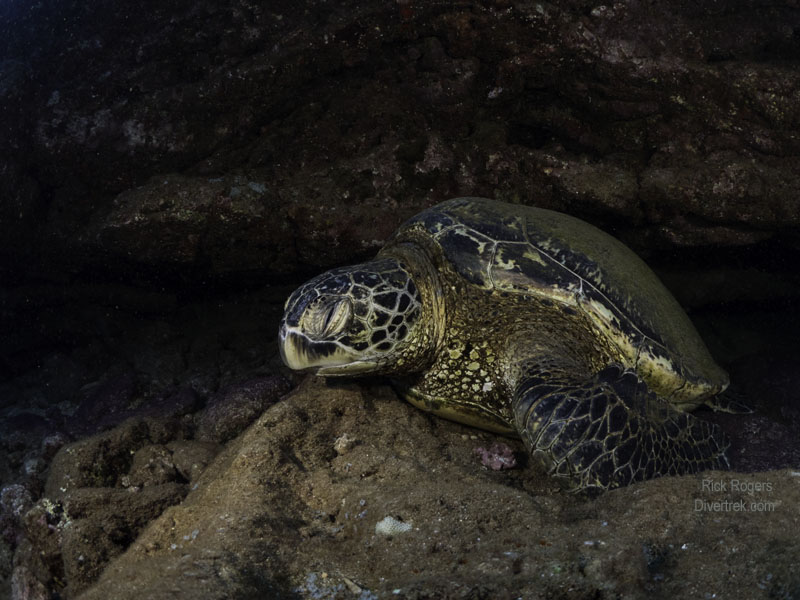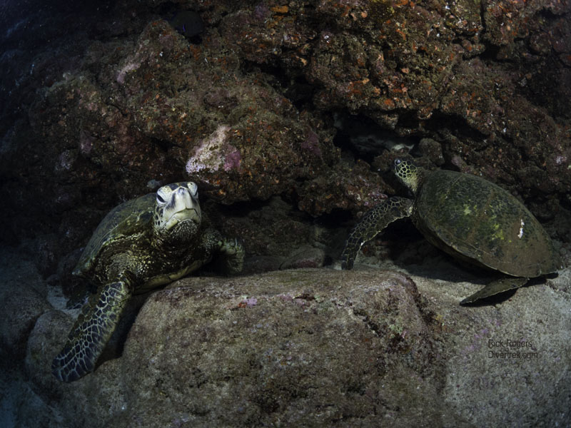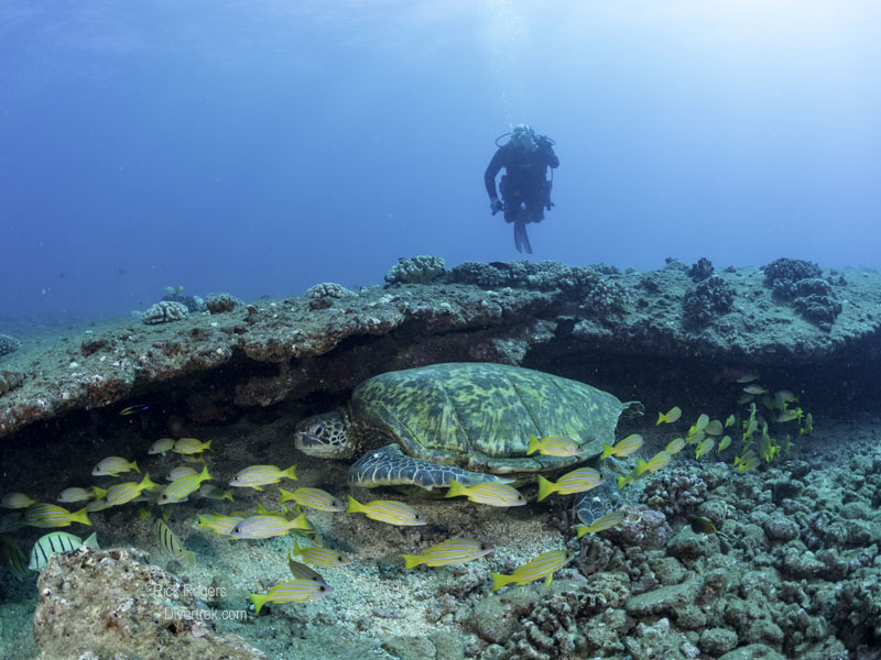 Kauai is the oldest of the Hawaiian islands, at approximately 5.1 million years, and as such it has had plenty of time to weather and erode. Unlike Oahau which has deep water drop-offs close to shore, Kauai has a much more sloping underwater topography that is surrounded by protective fringing reefs. The near shore areas is an algae-based ecosystem that is pockmarked with crevasses, lava tubes, underwater shelves, and rock formations. In other words, it forms the perfect turtle habitat. Every dive we did there had multiple turtle sightings and encounters. This is the very reason that the island has attracted National Geographic photographers to it.